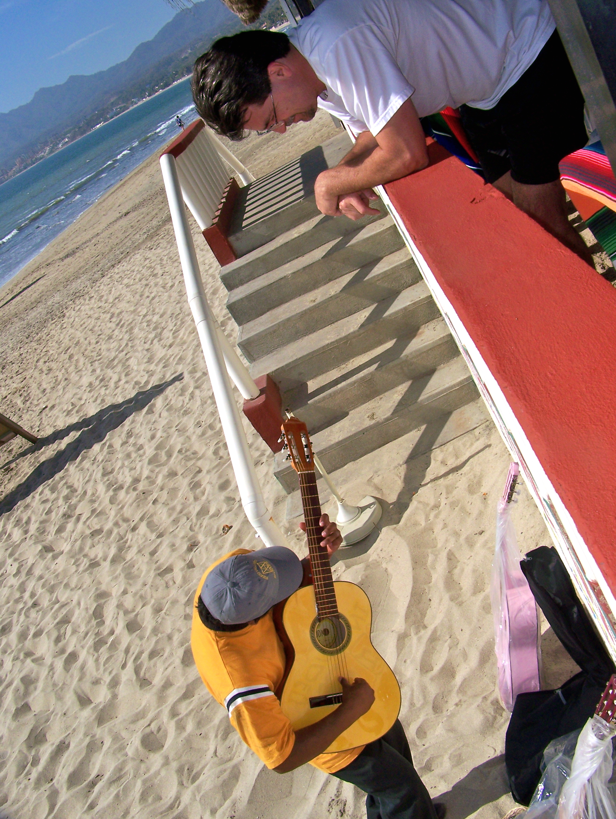 Chris buys a guitar on the beach.
